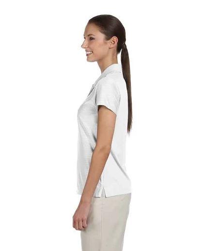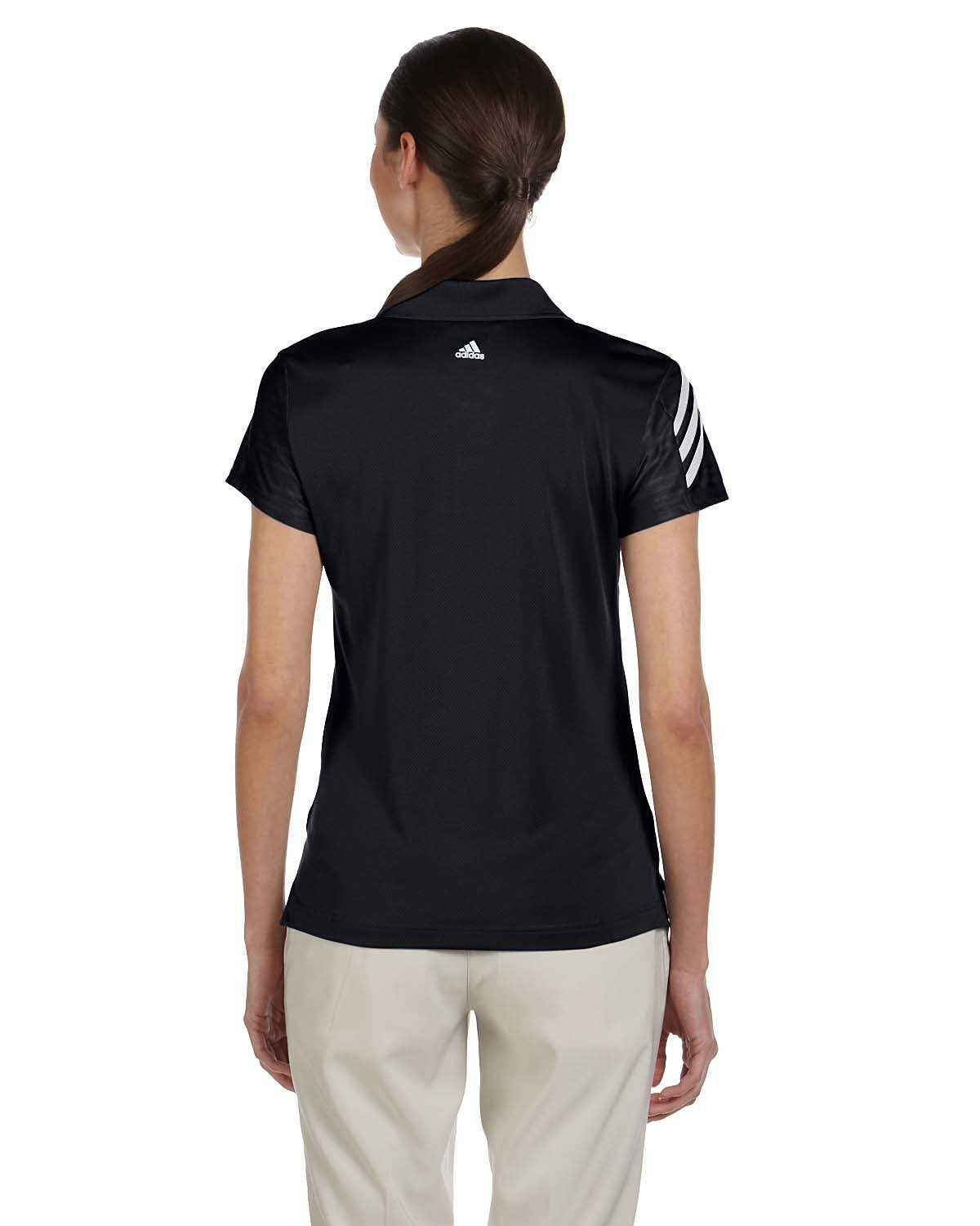 An Adidas Polo with subtle striped textured body front and sleeves; mesh ventilation back; rib knit collar; contrast adidas brandmark on back neck yoke; 3-Stripes on right shoulder; open-hem sleeves.