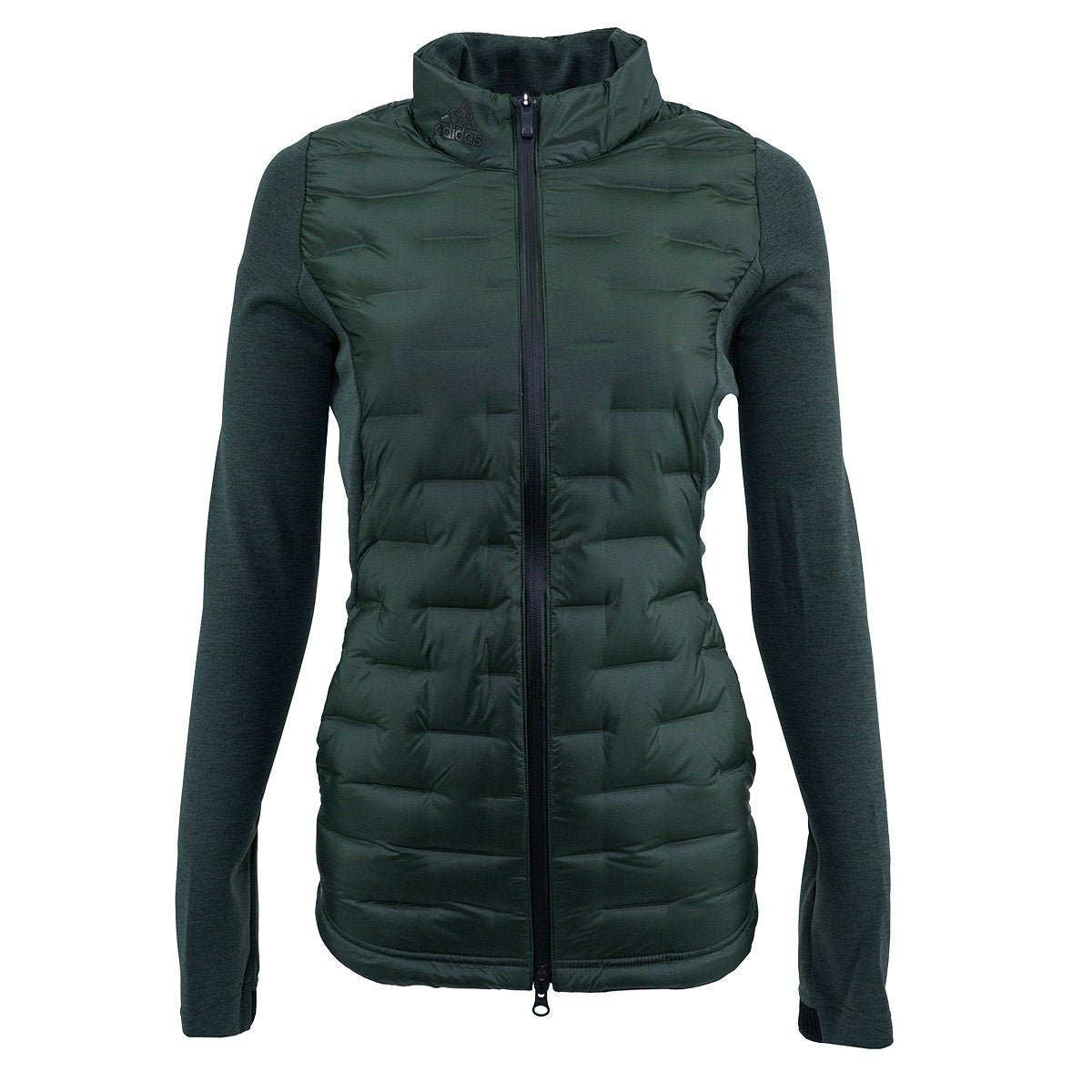 Layer up for cool-weather rounds. This golf jacket features quilted down insulation in the body to trap heat and keep you cosy and comfortable on the links. Bonded, no-stitch seams add warmth and a lightweight feel, while the knit back and side panels and sleeves allow for unrestricted movement and a smooth swing. A water-repellent finish sheds light rain, so you can play through in damp weather.