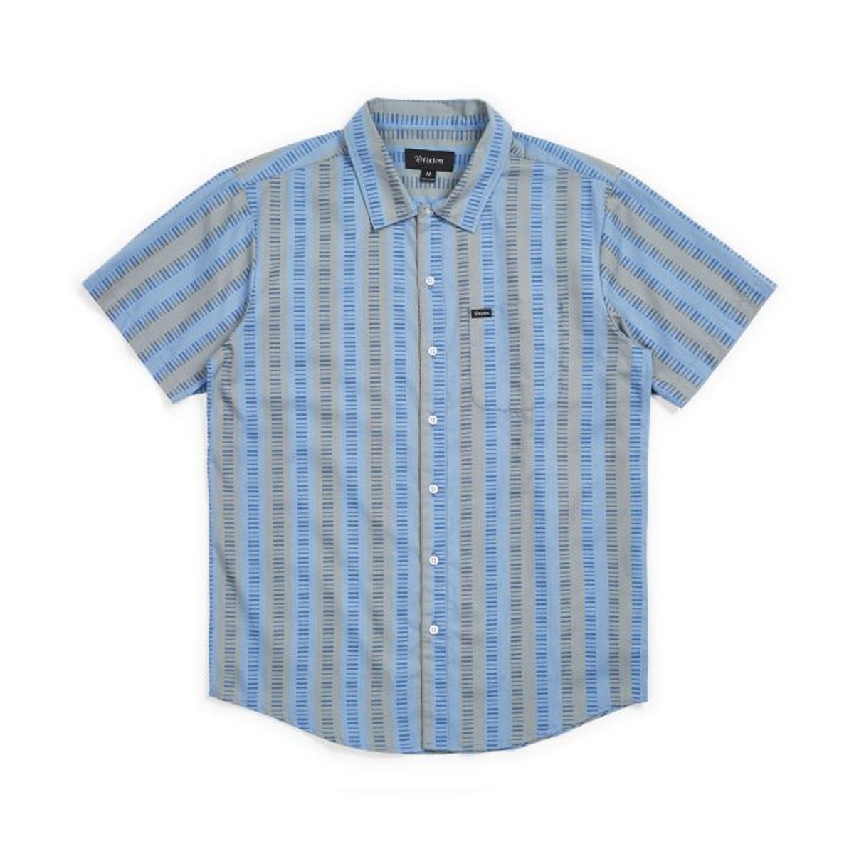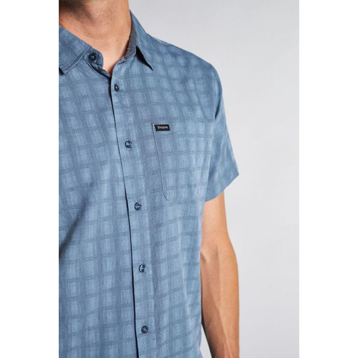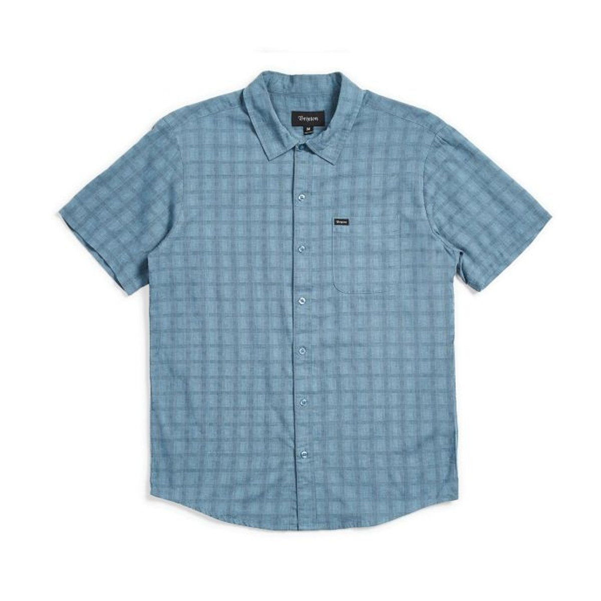 A short-sleeve button shirt made in cotton/poly yarn-dyed plaid fabric. It features a single chest pocket, a standard shirttail hem, adjustable sleeve cuffs, and a woven Brixton label at pocket.