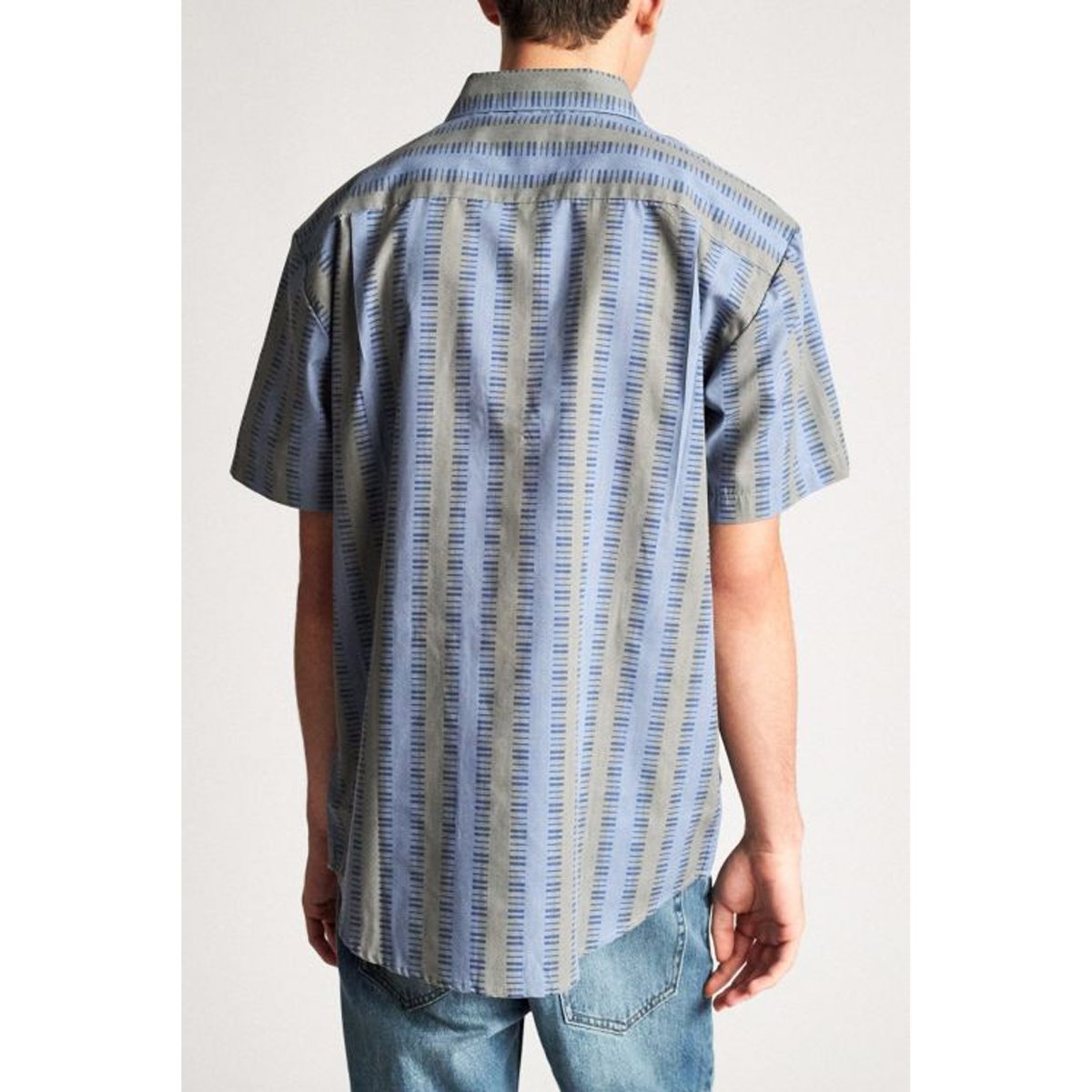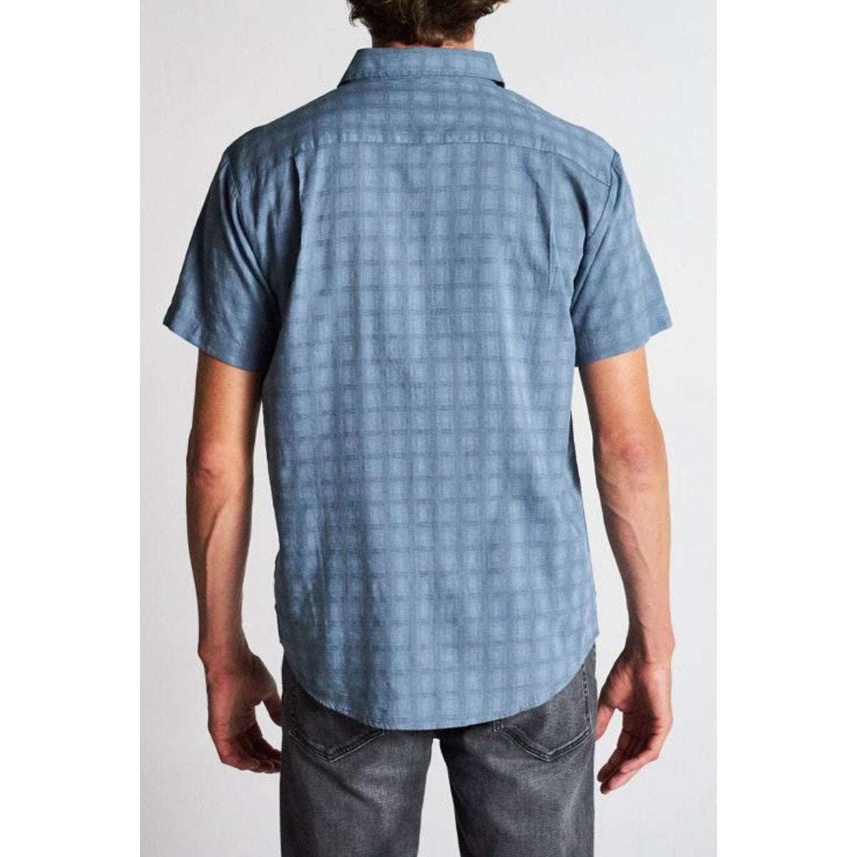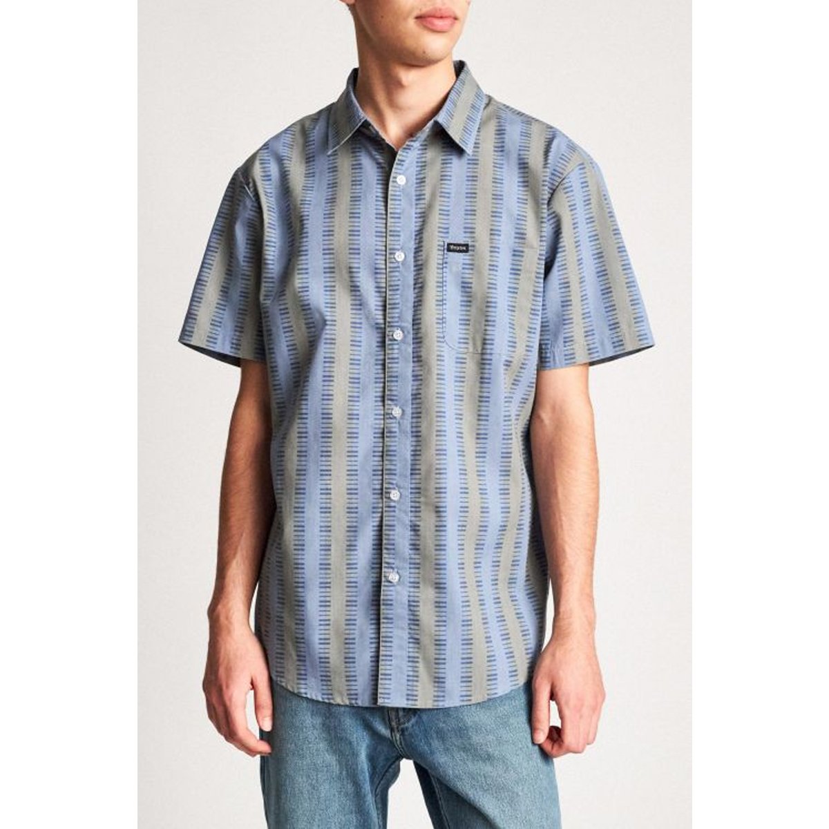 A short-sleeve button shirt made in cotton/poly yarn-dyed plaid fabric. It features a single chest pocket, a standard shirttail hem, adjustable sleeve cuffs, and a woven Brixton label at pocket.