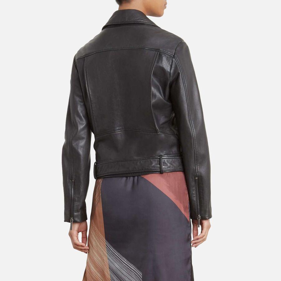 A chic faux leather jacket features a cool zip front silhouette with comfy rib knit accents.