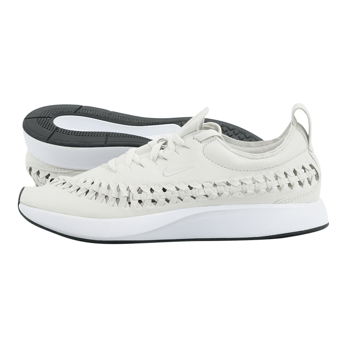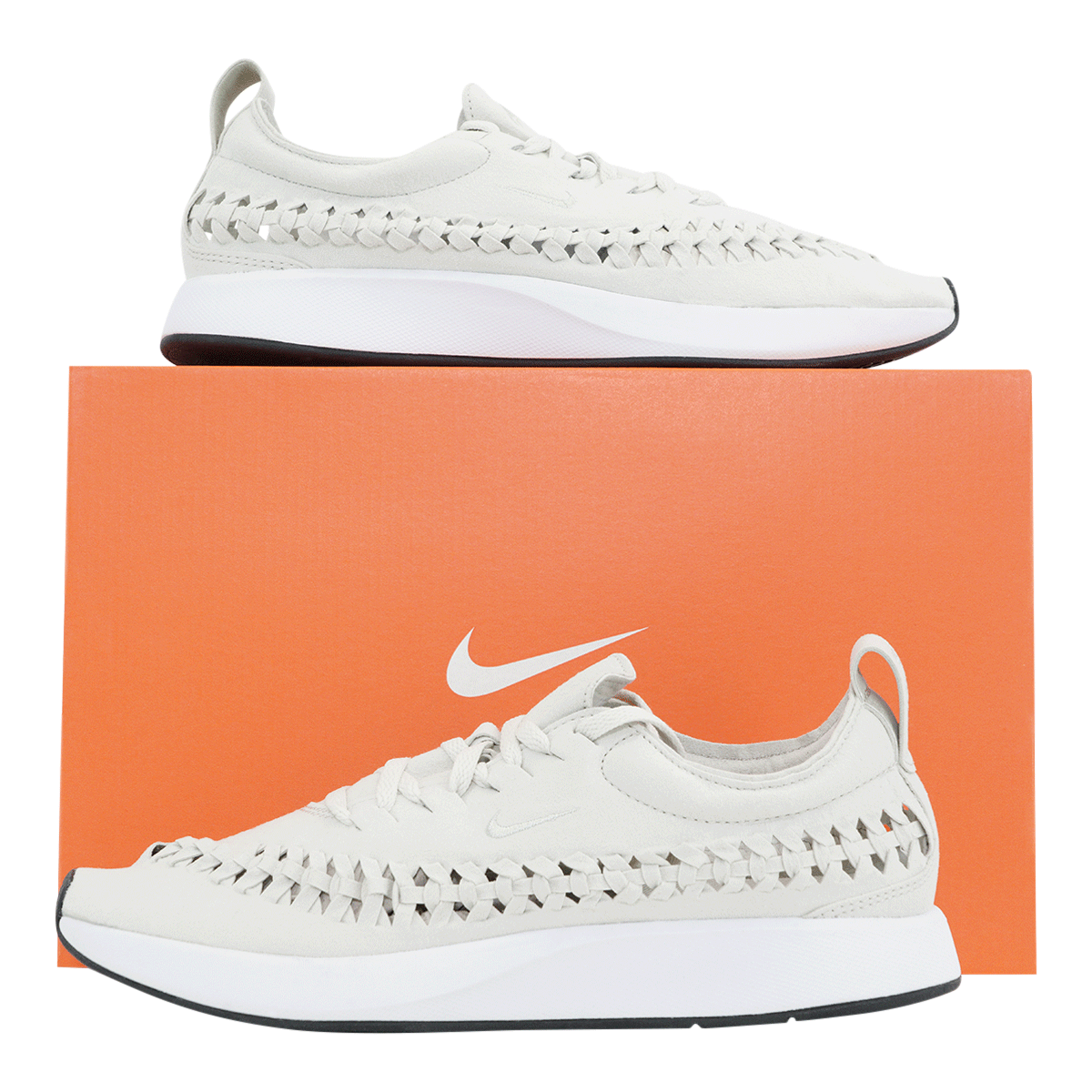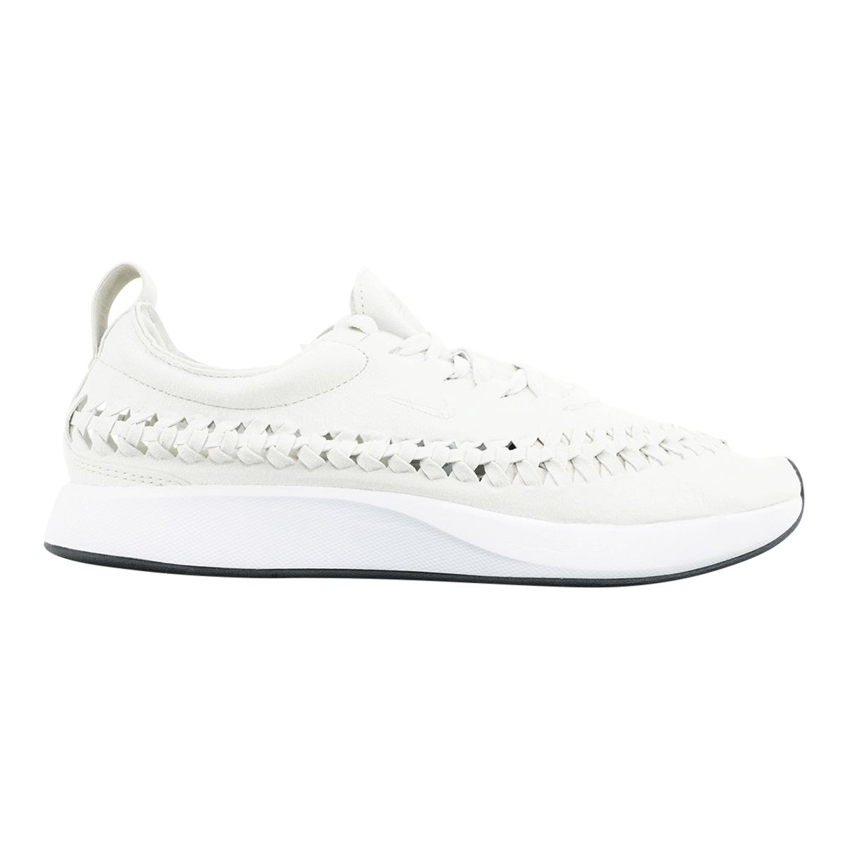 A band of woven detailing wraps asymmetrically around the foot of a racing-inspired sneaker styled for all-day comfort with a lightweight foam sole.