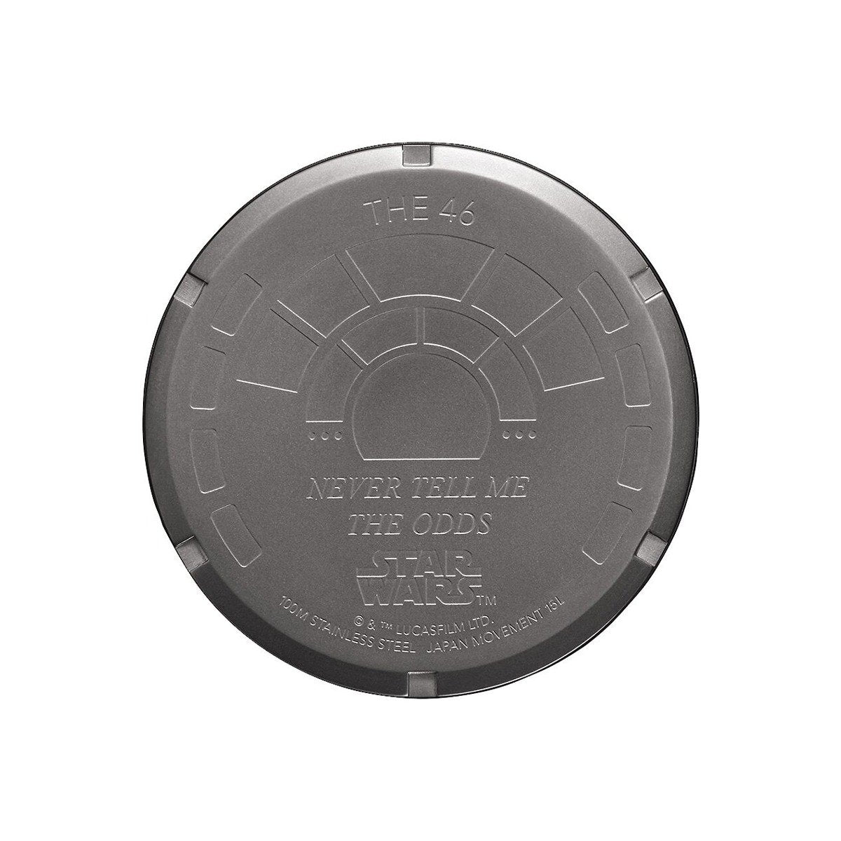 Never tell me the odds. This watch sports tumbled gunmetal to match Millennium Falcon's exterior, a cockpit window 12 o'clock hour marker and a dial ring that mimics the ship in hyperdrive.