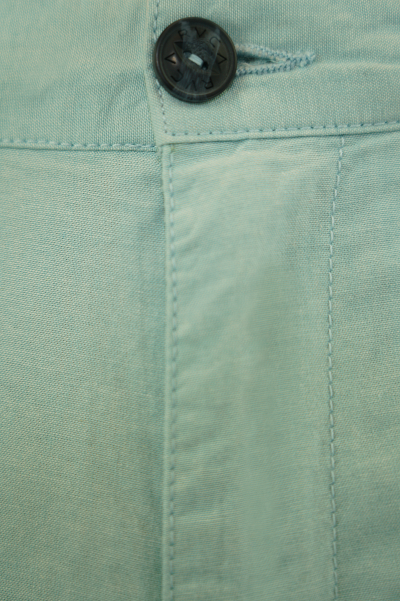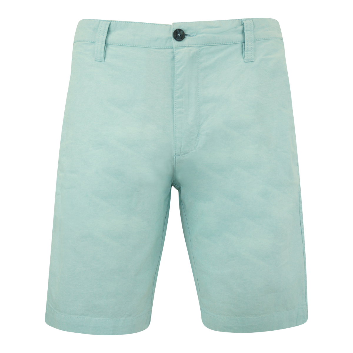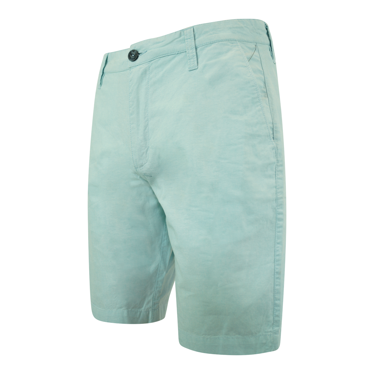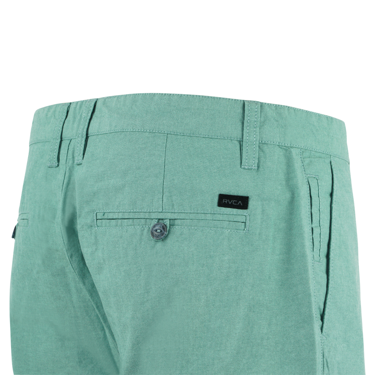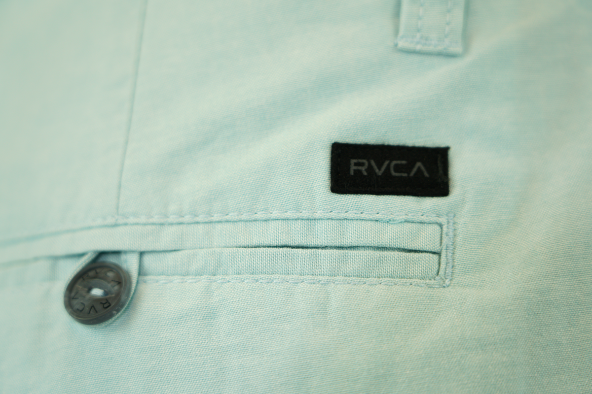 The RVCA That'll Walk Oxford Short features front pockets, a zipper fly with a single RVCA button closure, and back welt pockets with RVCA button closures. It has a coin pocket on the wearer's right side.
